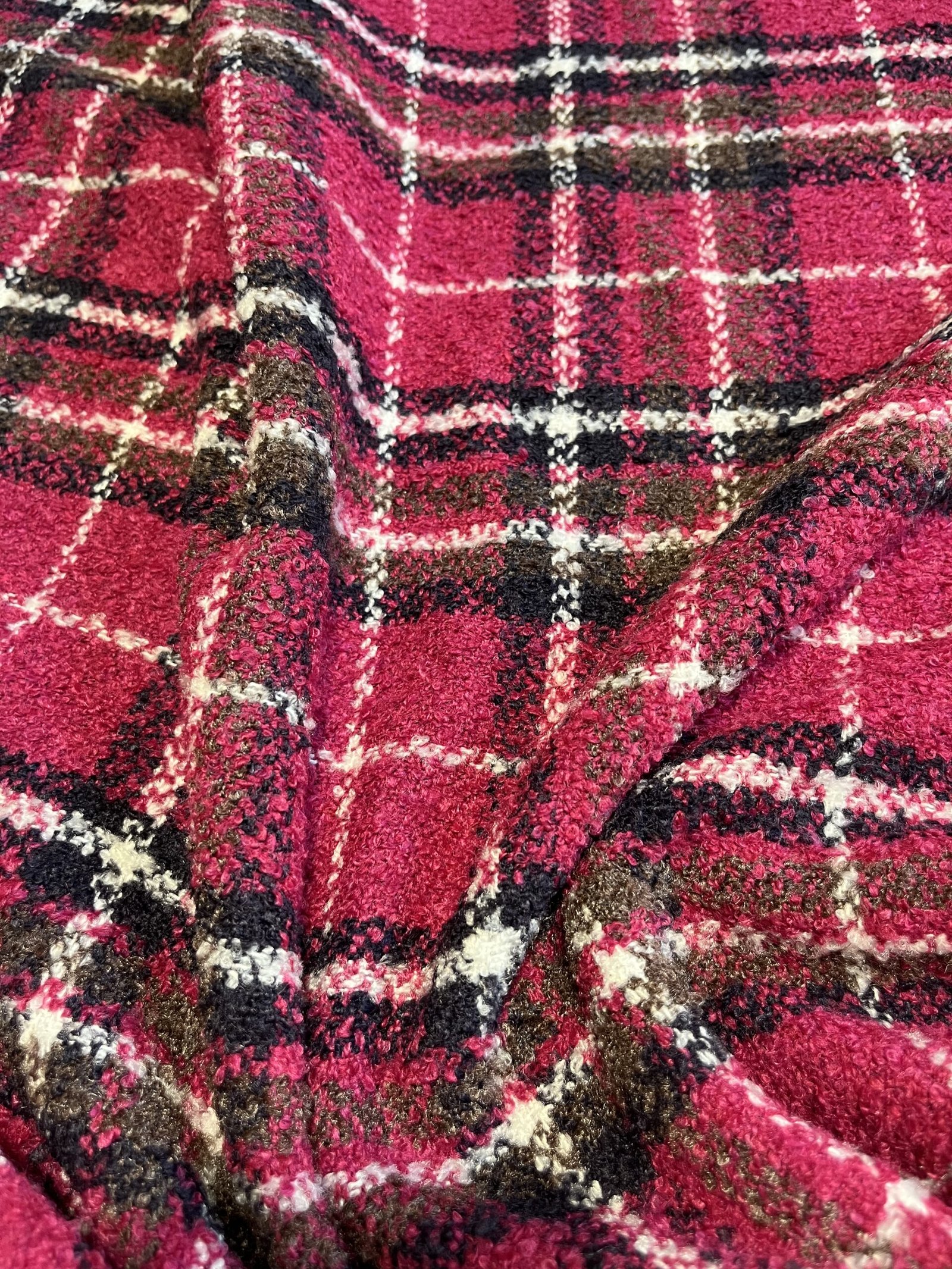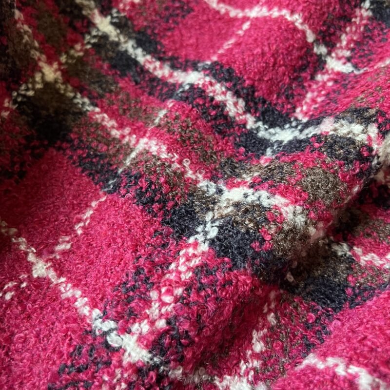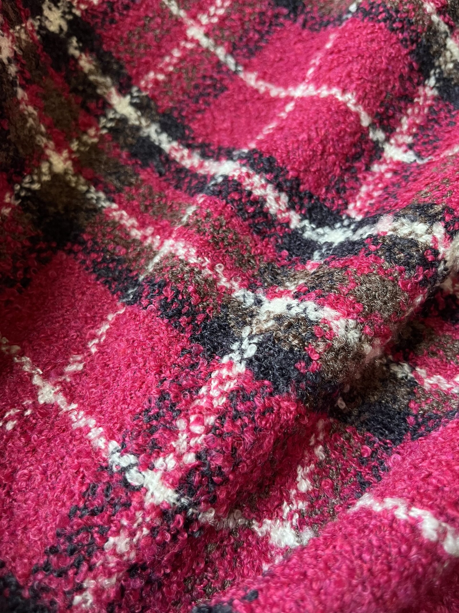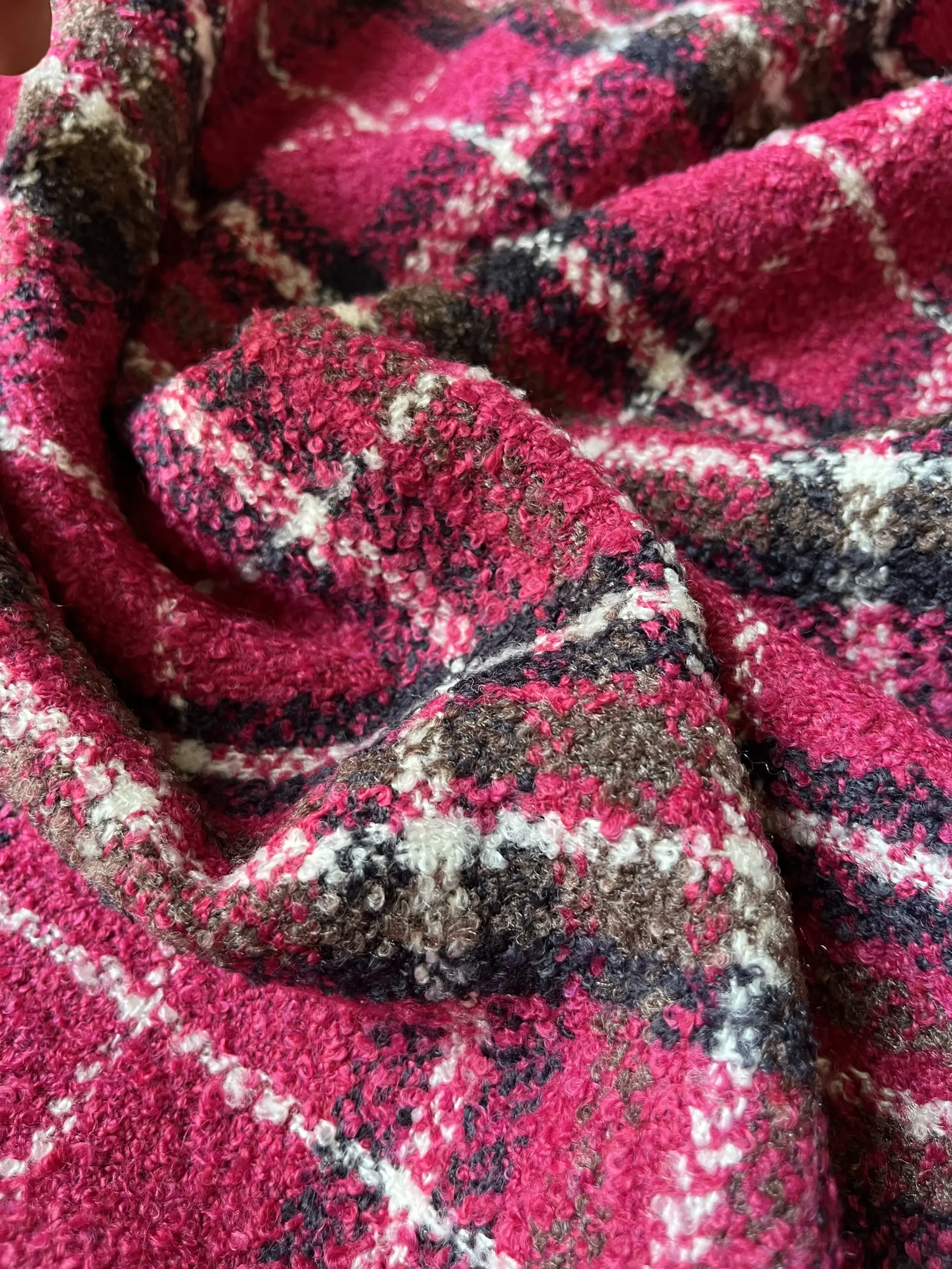 Το σχέδιο είναι ένα εντυπωσιακό καρό (plaid), όπου το κυρίαρχο χρώμα είναι το έντονο Φούξια/Ματζέντα. Οι ρίγες του καρό δημιουργούνται από χοντρές κλωστές σε αποχρώσεις του μαύρου, του σκούρου καφέ και του λευκού, προσδίδοντας βάθος και φινέτσα. Το ύφασμα είναι βαρύ (300γρ) και διαθέτει πλούσιο, χειμερινό κράτημα.