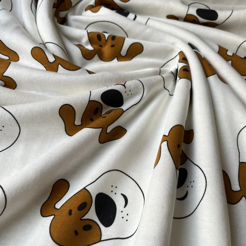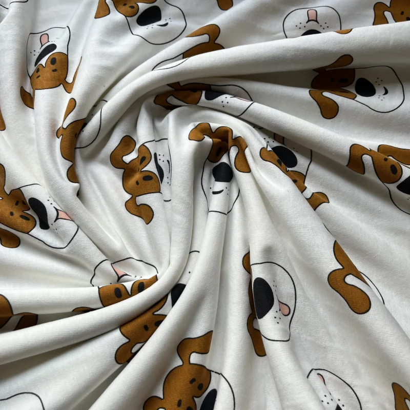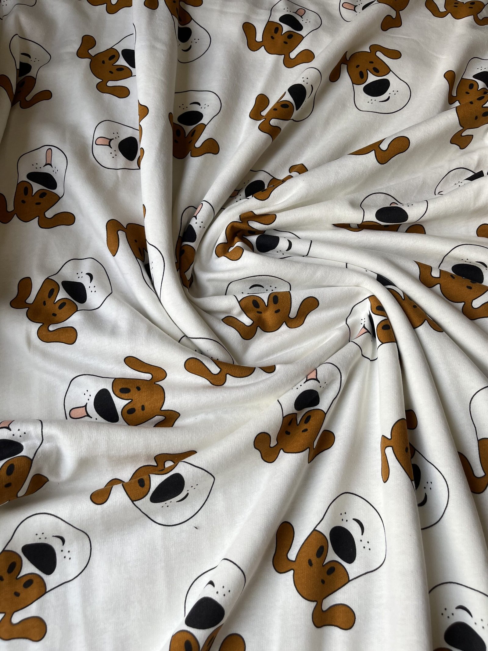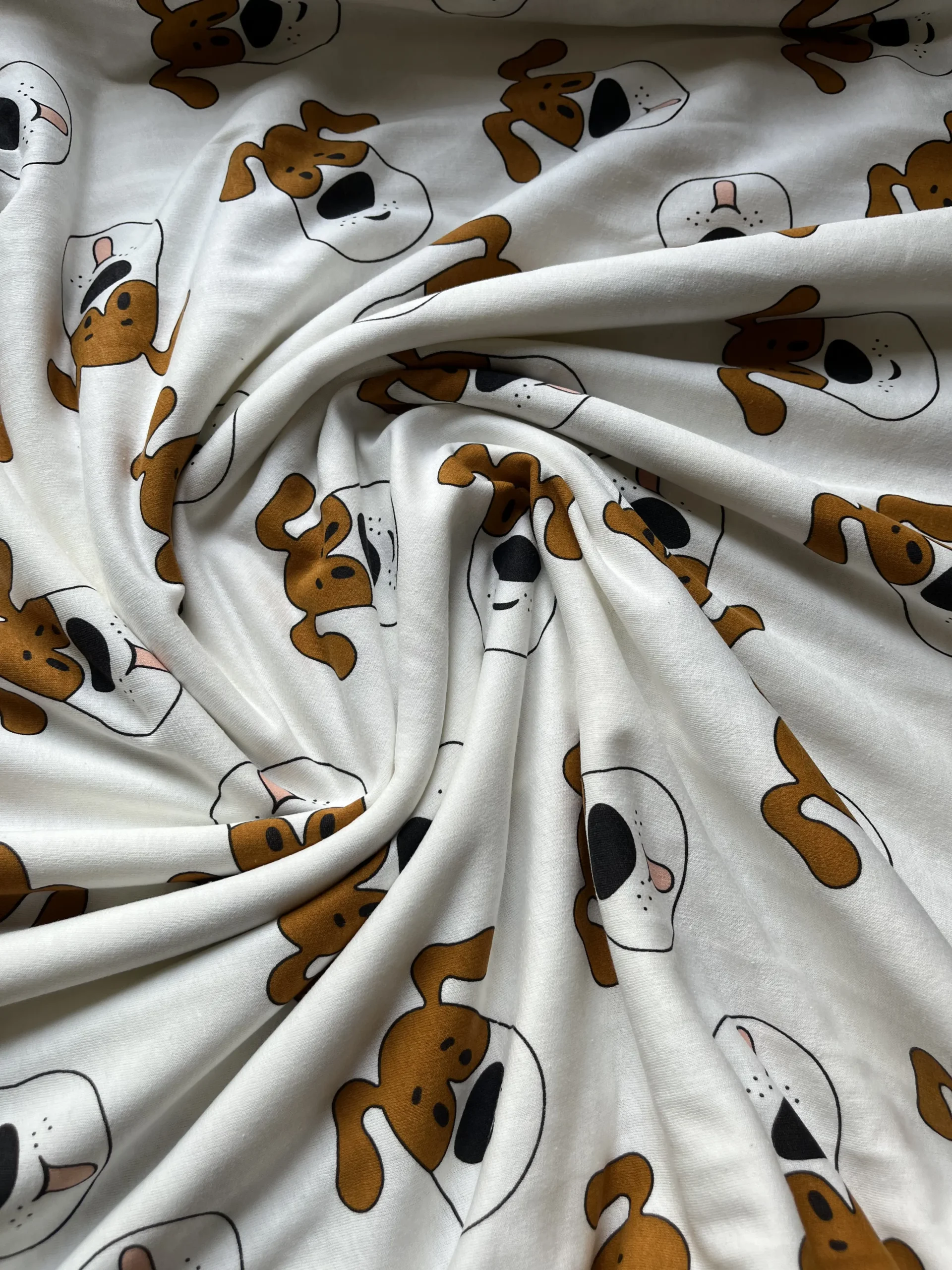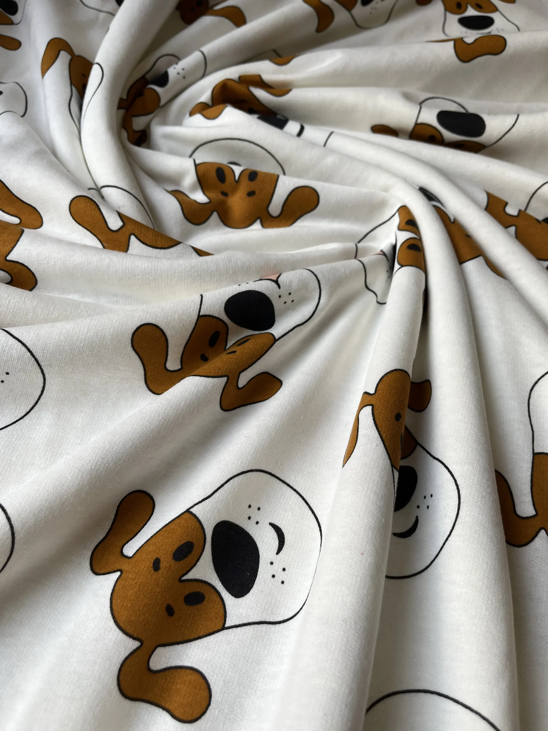 Το σχέδιο είναι ένα χαριτωμένο εμπριμέ με Σκυλάκια σε λευκή βάση, με καφέ και μαύρες λεπτομέρειες. Το φάρδος του (1.90μ) είναι ιδιαίτερα μεγάλο, προσφέροντας οικονομία στην κοπή.