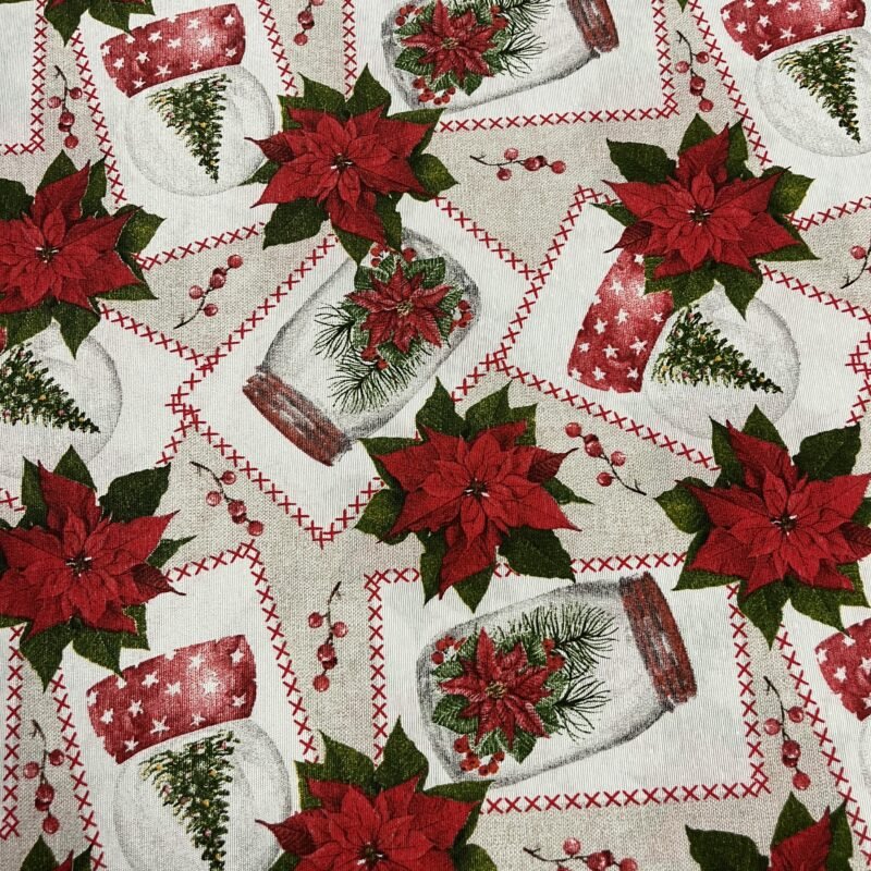 Λεπτό καραβόπανο – Κόκκινα Χριστουγεννιάτικα Λουλούδια & Χιονόμπαλες -Μπεζ βάση