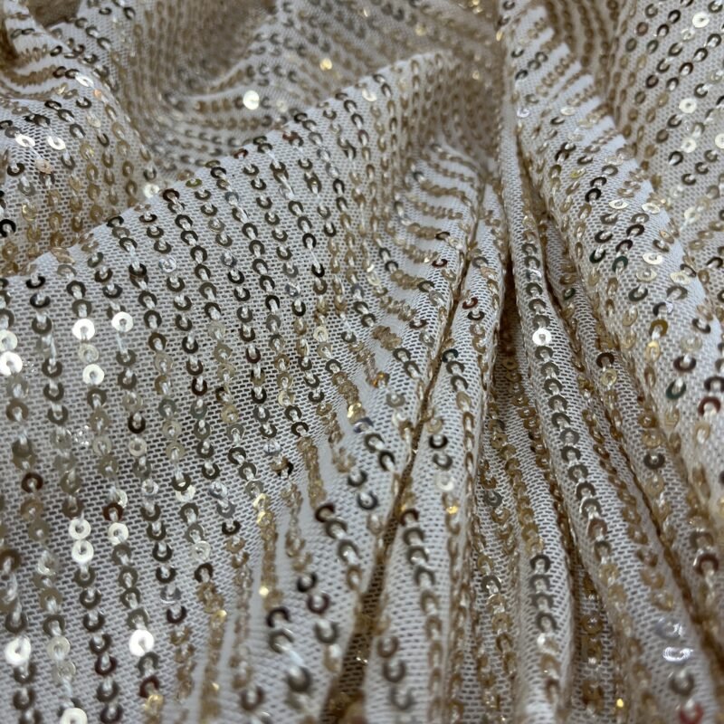 Υψηλής ποιότητας ελαστική παγιέτα με βάση μαλακό τούλι και μικρές, διακριτικές πούλιες που χαρίζουν εντυπωσιακή αλλά κομψή λάμψη. Το ύφασμα διαθέτει διπλή ελαστικότητα, προσφέροντας άνεση και άψογη εφαρμογή, ενώ παραμένει ευλύγιστο και ευχάριστο στην αφή. Ιδανικό για δημιουργίες που απαιτούν λάμψη και στυλ, χωρίς να βαραίνουν ή να «γρατζουνάνε» το δέρμα.
